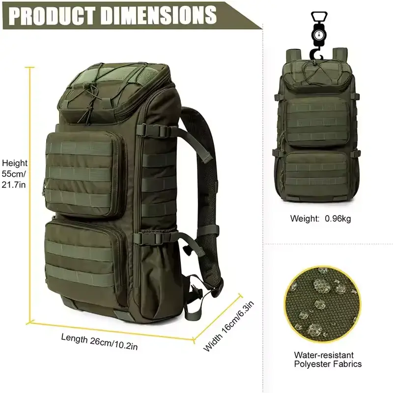 This day hiking backpack is designed with functionality and durability in mind. It features multiple compartments for organized packing, including top, front, and side pockets for easy access to your gear. The backpack is hydration system compatible, making it ideal for long hikes. It also includes MOLLE webbing for additional attachments and durable YKK zippers for reliability in tough environments.