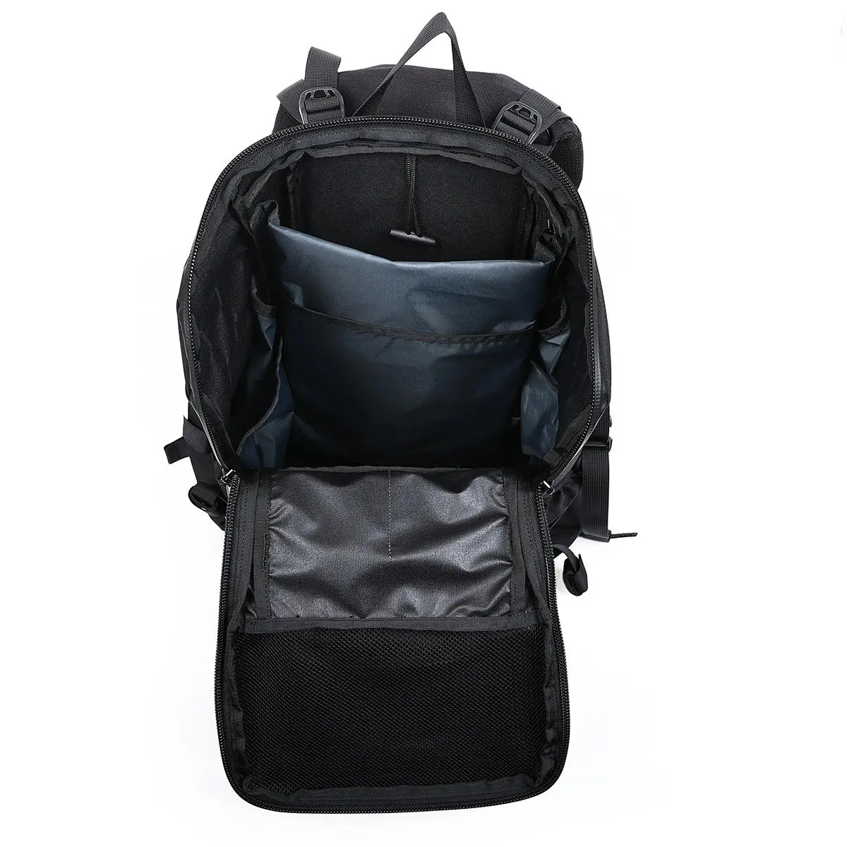 This heavy-duty black tactical backpack features modular MOLLE webbing, multiple organized compartments, and ergonomic padding, engineered for tactical operations, outdoor expeditions, and gear-intensive daily carry.