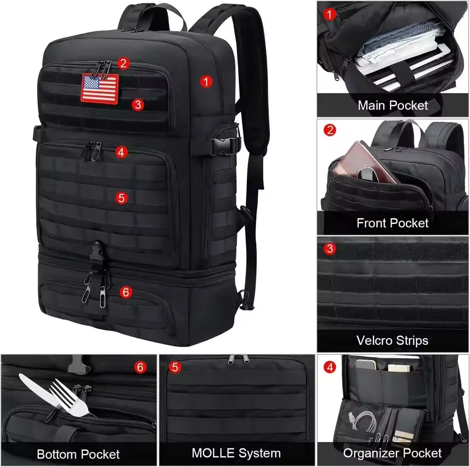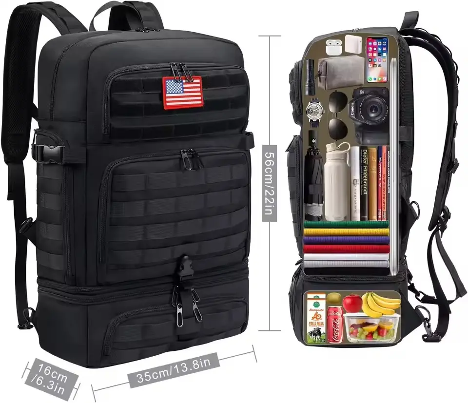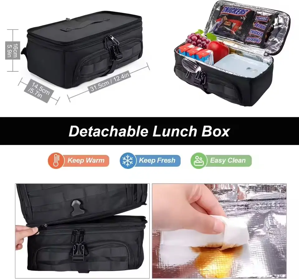 This black tactical backpack merges modular MOLLE storage, multi-compartment organization, and a detachable insulated lunch box—blending tactical durability with everyday functionality for work, school, travel, and outdoor use.