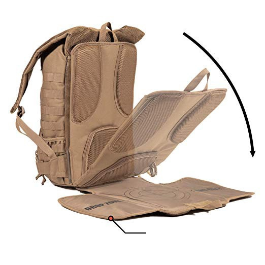 Diese Tasche wurde ursprünglich als taktische Wickeltasche konzipiert und enthält praktische Extras wie eine integrierte, herausnehmbare Wickelauflage und einen Kinderwagengurt.