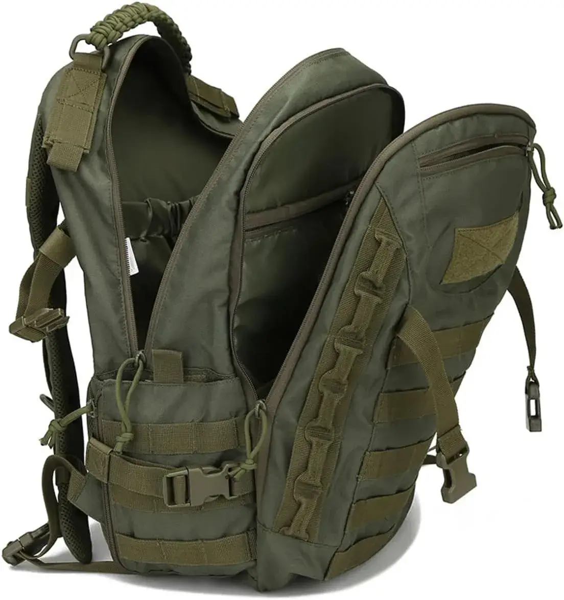 This tactical backpack features MOLLE webbing for attaching pouches, a braided paracord handle (usable as emergency cordage), and breathable mesh padding for all-day comfort.