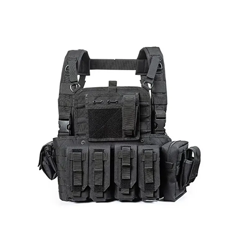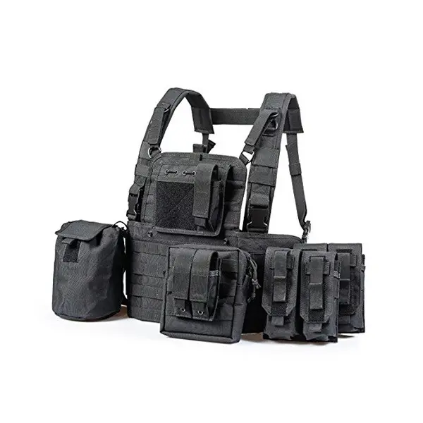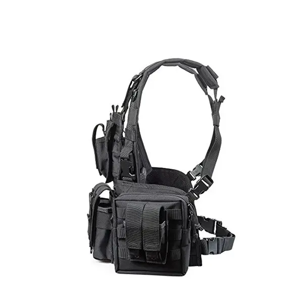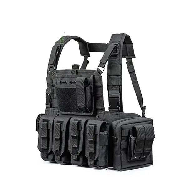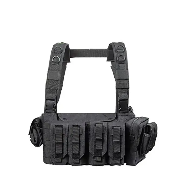 This black tactical chest rig (a lightweight alternative to full plate carriers) features 4 integrated mag pouches, detachable auxiliary pouches, MOLLE webbing, and adjustable straps—engineered for fast gear access during tactical training, airsoft, or security patrols, with a modular design to tailor loadouts to specific needs.