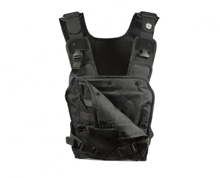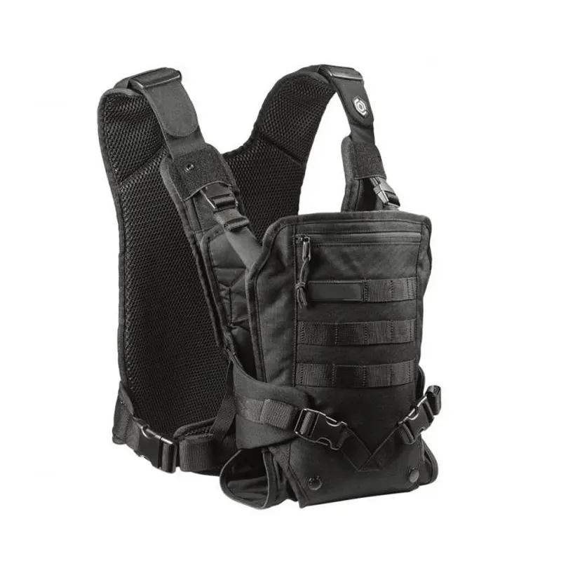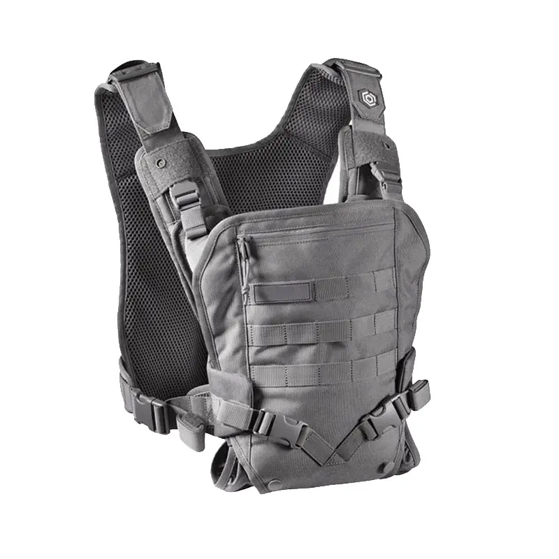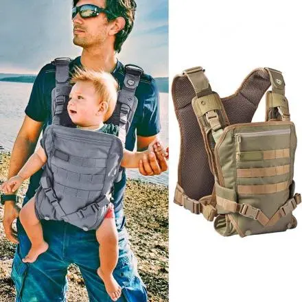 This tactical-style baby carrier vest blends durable outdoor gear design with baby-carry functionality: it features MOLLE webbing for parent essentials, breathable mesh straps, and a secure harness – built for hiking, beach trips, or active daily use, with a vest-style build that balances baby comfort and parent gear storage.