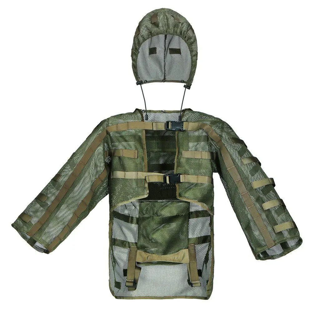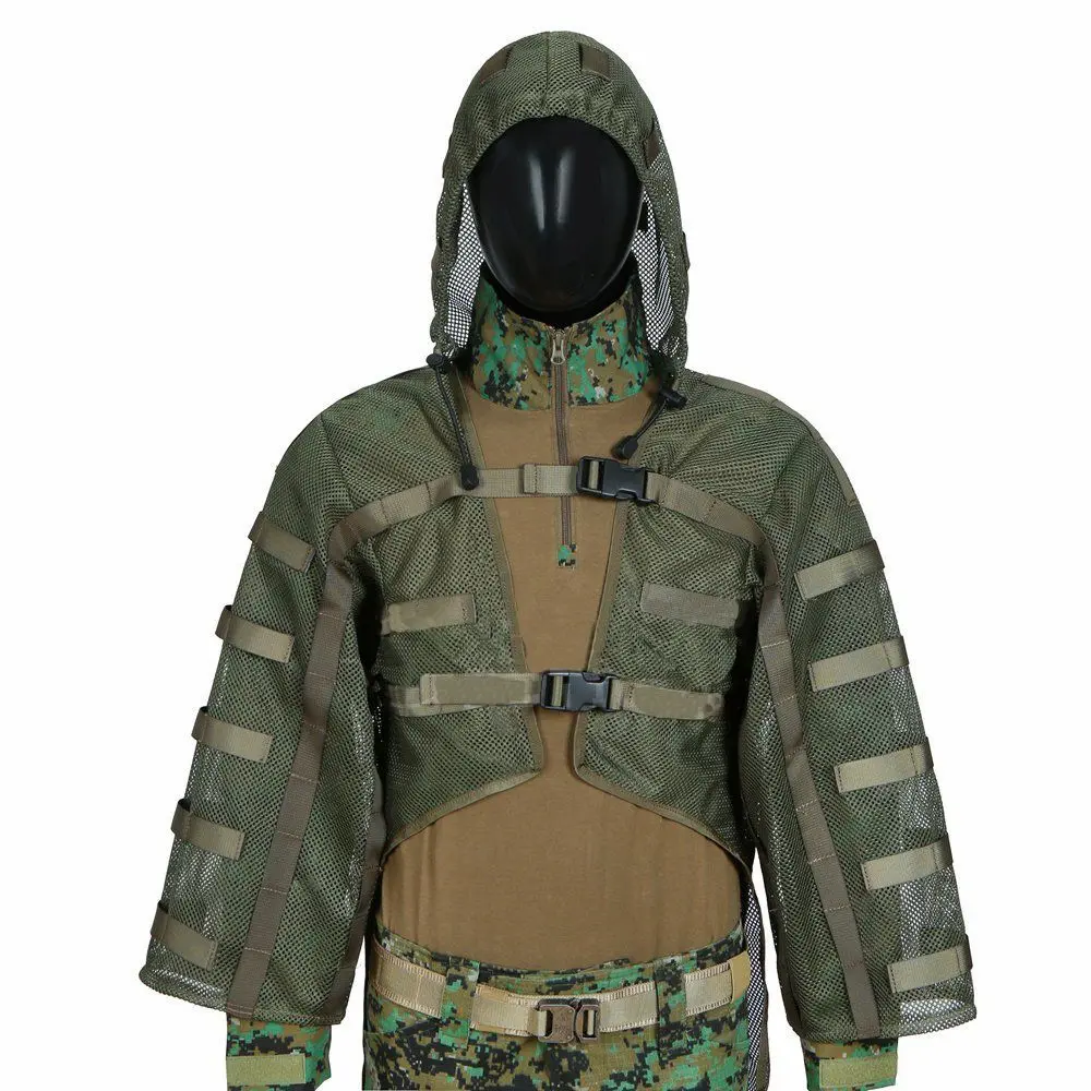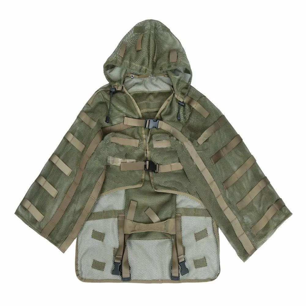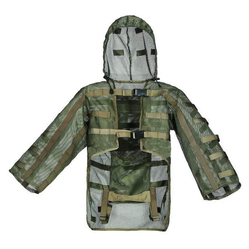 This upper-body-only modular ghillie suit base is designed to let you build a custom camouflage layer without the bulk of a full suit, featuring breathable mesh fabric and MOLLE webbing for attaching natural vegetation or synthetic camo. Lightweight and quick-drying, it’s ideal for hunters, snipers, and airsoft players who need mobility and stealth in warm environments.