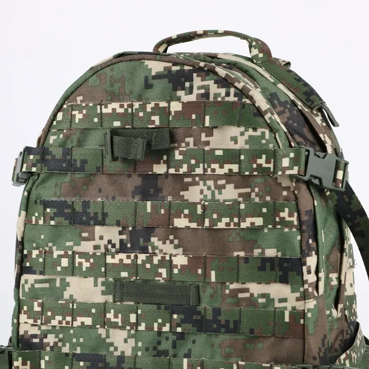 This digital camo tactical backpack (woodland-focused pixelated pattern) features full-body MOLLE webbing, multi-point adjustable buckles, and a rugged, streamlined build—engineered for modular gear organization in tactical training, outdoor expeditions, or field operations.