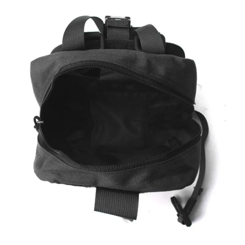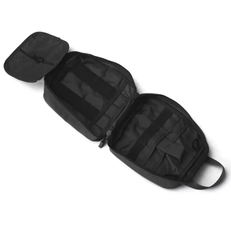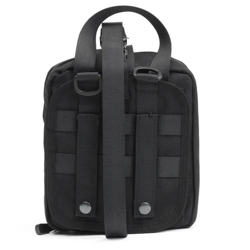 This black rip-away tactical MOLLE pouch (designed for EMT/medical first aid use) combines a quick-release detachable panel, interior supply organizers, and multi-carry options. Built for emergency scenarios, it enables fast access to medical gear (via rip-away functionality) while integrating into modular tactical/vest loadouts—ideal for urgent care, patrols, or outdoor safety.